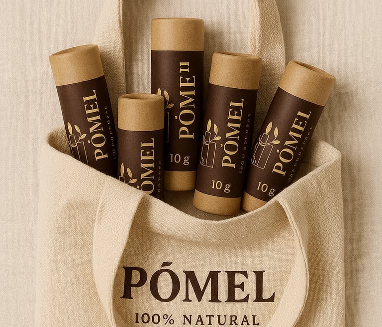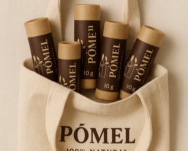 Pómel es una marca de bálsamo labial natural, sin conservantes artificiales, disponible en colores rojo y beige.
